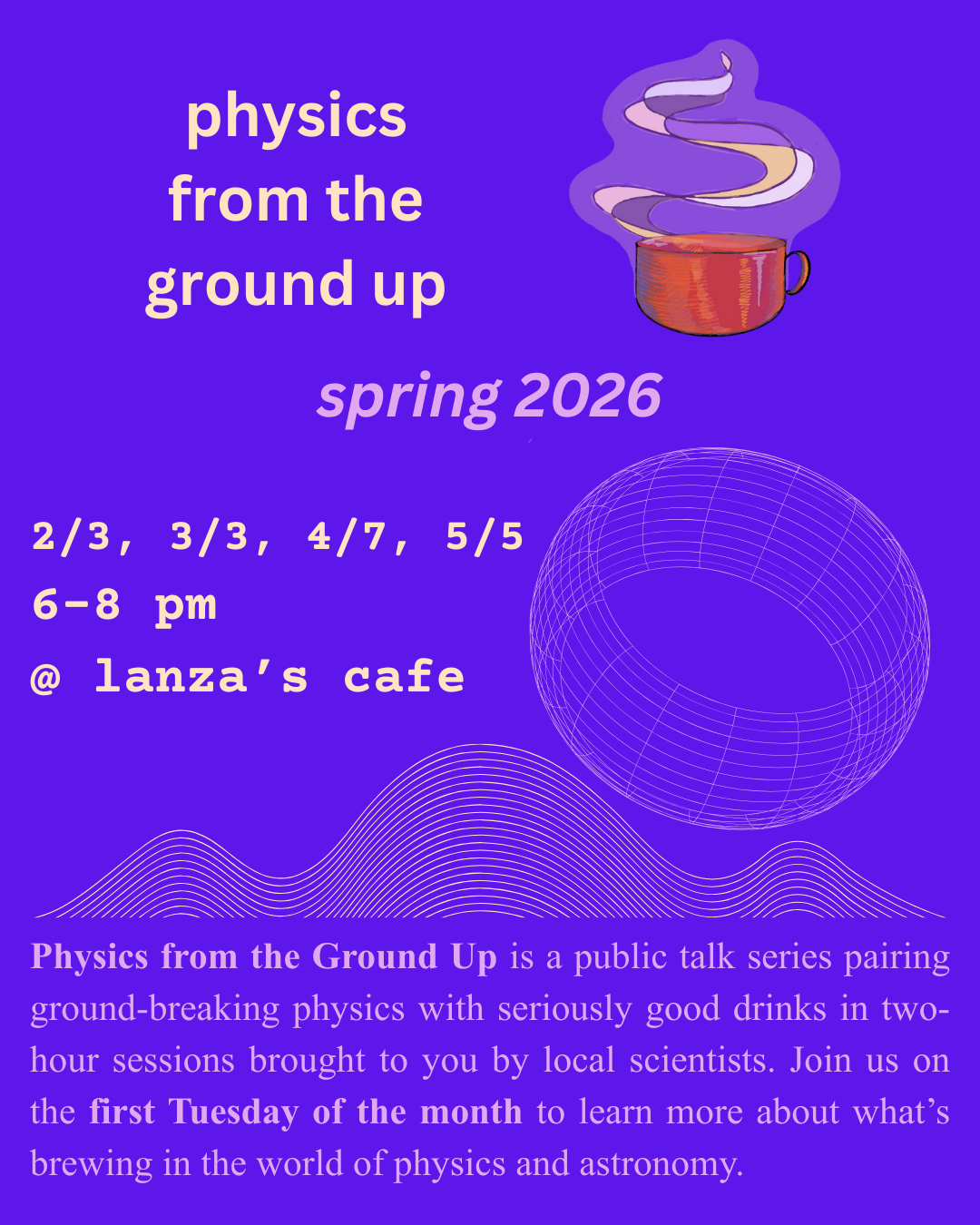 Originally started by Reilly Milburn, Physics From the Ground Up is a public engagement opportunity for UNC department of physics faculty, graduate students, and undergraduate students to give brief lectures to a general audience. This happens at Lanza's Cafe once a month during the academic semester. I am the head organizer, host, and team leader for this. I love outreach, and having my own event has allowed me to reach the public in a number of different ways. If you are interested in giving a talk, please reach out to me at the email link below!